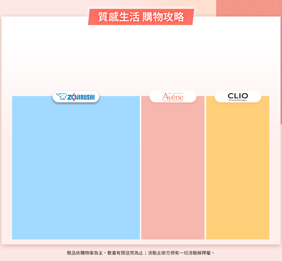 優惠商品數量有限,售完為止。本廣告活動頁商品規格、顏色、價位、贈品如與購物車不符,以購物車標示為準